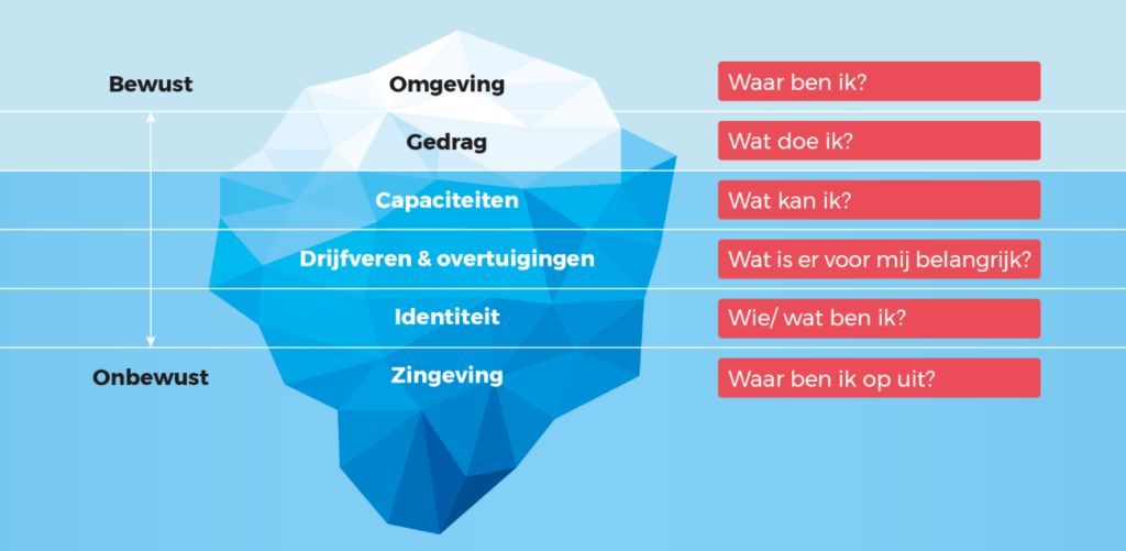 In zijn ijsbergmodel draait het boven de waterlijn van de ijsberg om kennis, vaardigheden en gedrag. Dat is wat anderen ons zien doen, wij kijken ook naar anderen. Onder de waterlijn is de mengeling van het ´denken´ en ´willen´, een combinatie van normen, waarden & overtuigingen en het eigen beeld.